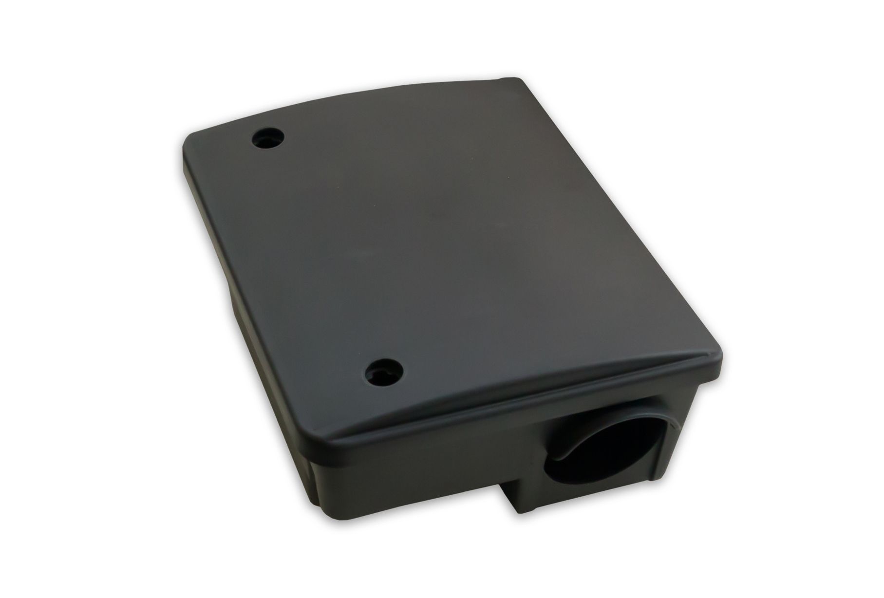 Plastová deratizačná stanička Coral v čiernej farbe, ideálna na použitie pri stenách, pod…